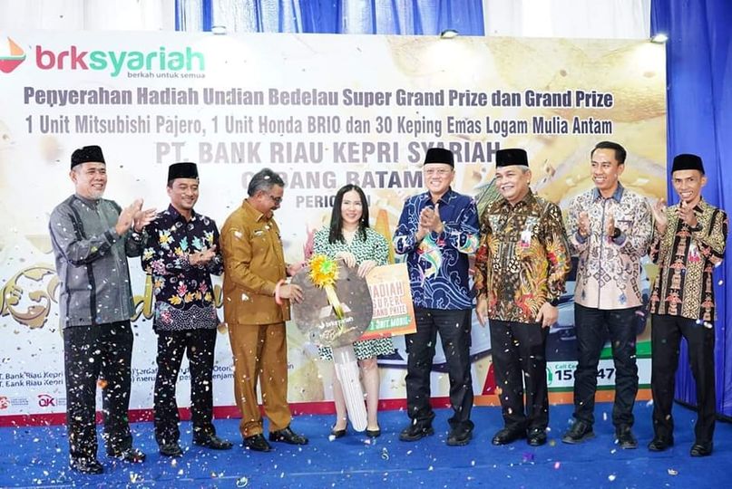 BATAMCENTER, KataBatam- Sekretaris Daerah (Sekda) Kota Batam H Jefridin ikut menyerahkan hadiah Super Grand Prize Bank Riau Kepri (BRK) Syariah Bedelau, berupa mobil Mitsubishi Pajero Sport, di Kantor BRK Syariah, Sungaipanas, Batamkota, Senin (30/1/2023).