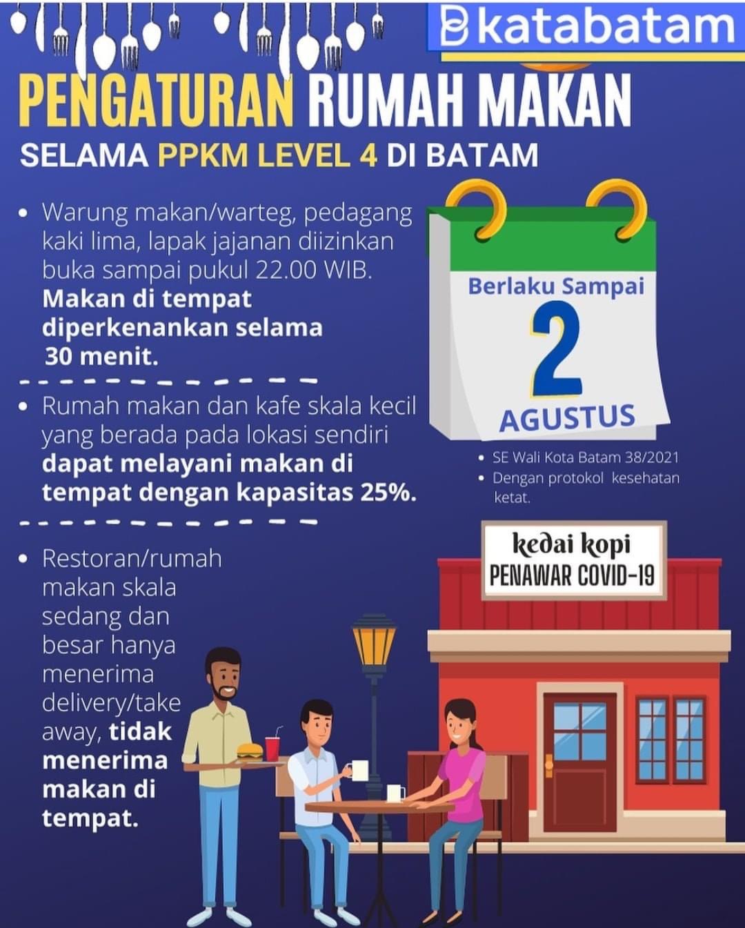 KEGIATAN makan-minum di tempat umum diatur secara khusus dalam Surat Edaran Wali Kota Batam Nomor 38 Tahun 2021 tentang Pemberlakuan Pembatasan Kegiatan Masyarakat (PPKM) Level 4 Covid-19 di Kota Batam.