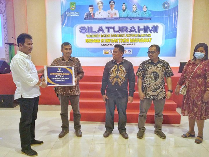 NONGSA, KataBatam- Wali Kota Batam H Muhammad Rudi (HMR) menyerahkan honorarium kepada RT/RW dan bersilaturahmi bersama tokoh masyarakat Kecamatan Nongsa di Hokkie Hotel, Kabil, Nongsa, Batam, Kamis (22/6/2022).