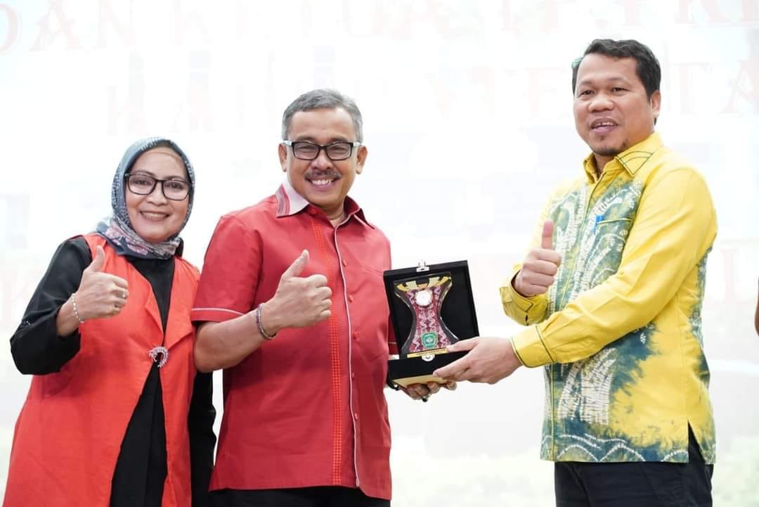 SEKDA Jefridin, didampingi Wakil Ketua TP-PKK Kota Batam Hj Hariyanti Jefridin, menerima cendera mata, di sela membuka Bimtek, yang diikuti Kades & Ketua Tim Penggerak PKK Desa se-Kabupaten Tapin, Provinsi Kalsel, di Ballroom Hotel Nagoya Hill Batam.