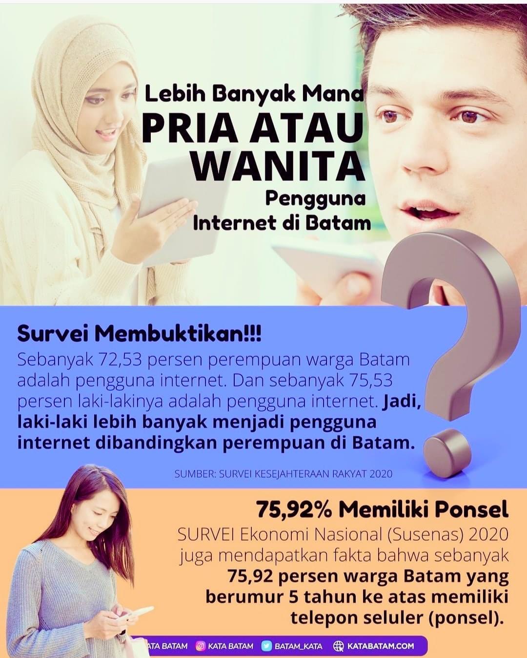SURVEI KESEJAHTERAAN Rakyat 2020 membuktikan bahwa laki-laki di Batam lebih banyak menggunakan internet dibandingkan perempuannya. Perbandingannya 75,53% berbanding 72,53 persen.
