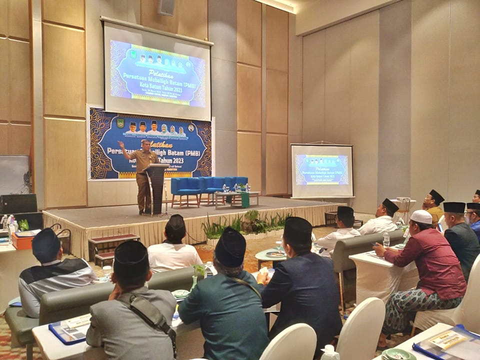 BATAMCENTER, KataBatam- Wali Kota Batam H Muhammad Rudi (HMR) membuka pelatihan Persatuan Mubalig Batam (PMB), di Hotel Harris, Batam Centre, Batam, Senin (6/3/2023).