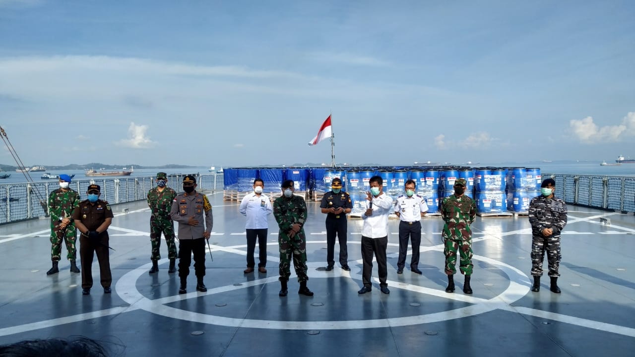 Dalam acara yang digelar di atas KRI Semarang tersebut (lihat foto), secara simbolis diserahkan 2.100 liter konsentrat sanitizer (tanpa alkohol).