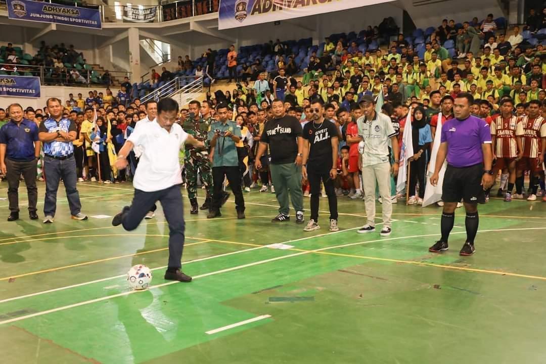 MUKAKUNING, KataBatam- Wali Kota Batam/Kepala Badan Pengusahaan Batam H Muhammad Rudi (HMR), melakukan tendangan perdana pertanda dimulainya Adhiyaksa Kepri Cup Futsal Tournament 2024, di Sport hall Temenggung Abdul Jamal, Mukakuning, Jumat (12/7/2024).