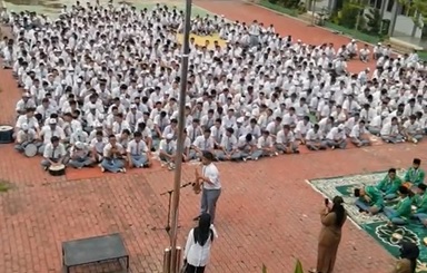 “Selamat datang bu Hj Marlin… Selamat datang bu Hj Marlin… Dari kami SMA 8…” sambut mereka lewat lagu.