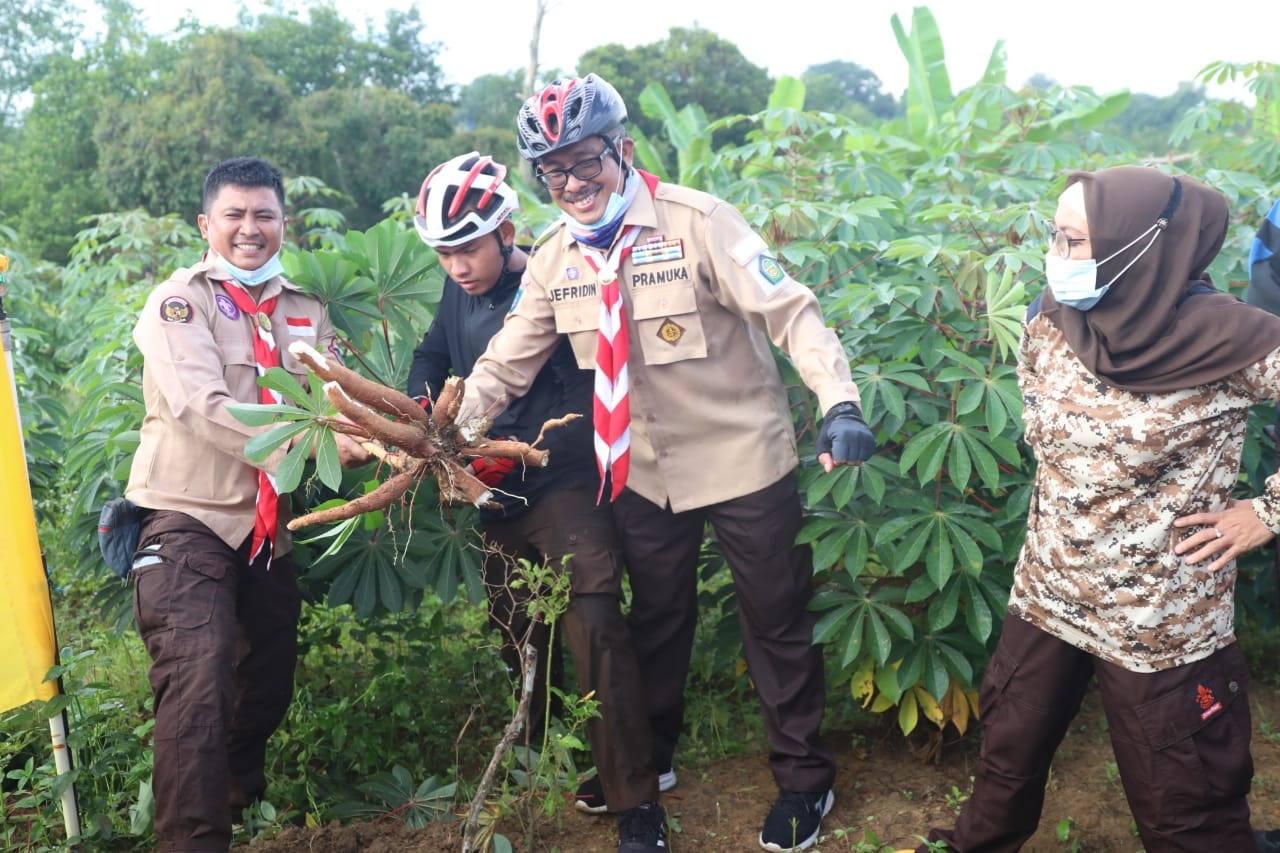 SAAT gowes Pramuka Peduli ke Batamkota, Sabtu (11/7/2020) Jefridin, selaku ketua, bersama rombongan sempat memanen singkong.