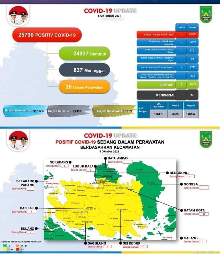 PENANGANAN Covid-19 di Batam kian menunjukkan tren yang baik. Hari ini, Selasa (5/10/2021) tidak ada penambahan kasus baru alias nihil.
