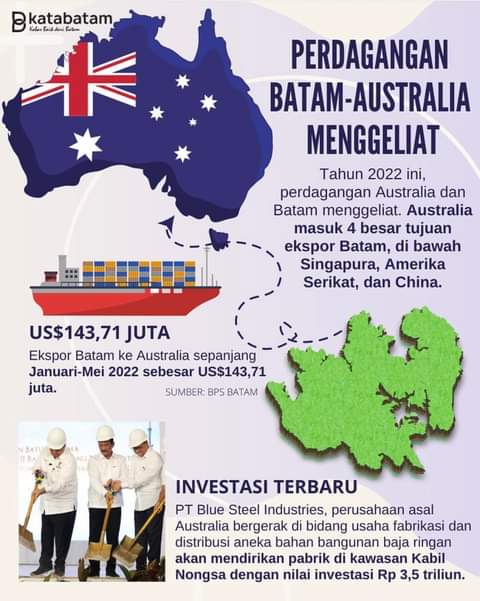 BATAM, KataBatam– Australia kini menjadi sekutu baru di bidang perdagangan. Di tahun 2022 ini, perdagangan Australia dan Batam menggeliat. Australia masuk 4 besar tujuan ekspor Batam, di bawah Singapura, Amerika Serikat, dan China.