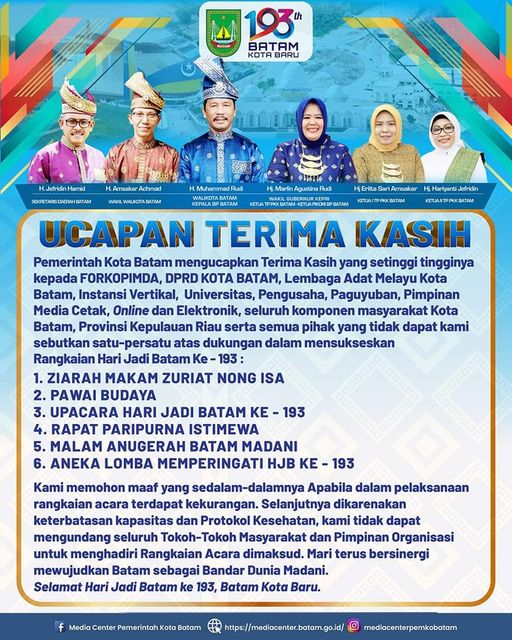 Juga Lembaga Adat Melayu, universitas, pengusaha, paguyuban, dan seluruh komponen masyarakat Kota Baram atas dukungannya menyukseskan rangkaian momen yang menjadi milestone berdirinya pemerintahan Kota Batam ini.