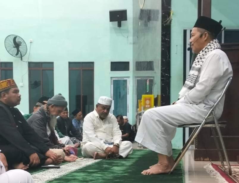 TAKZIM: Calon Wakil Gubernur Kepri H Aunur Rafiq, duduk bersila seraya takzim mendengar ceramah agama dalam kajian usai Subuh, di masjid Karimun, belum lama ini. Perilaku yang baik akan memancarkan karakter yang baik juga.