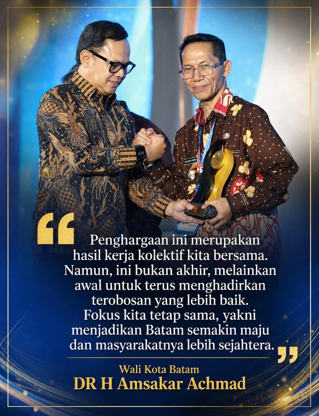 “Penghargaan ini merupakan hasil kerja kita bersama. Namun, ini bukan akhir, melainkan awal untuk terus menghadirkan terobosan yang lebih baik. Fokus kita tetap sama, yakni menjadikan Batam semakin maju dan masyarakatnya lebih sejahtera,” ujar Wali Kota Batam DR H Amsakar Achmad.