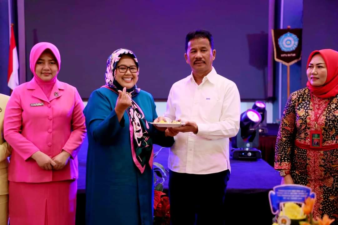 BERPIKIR POSITIF: Wali Kota Batam H Muhammad Rudi (HMR), menerima potongan tumpeng dari Ketua TP- PKK Kota Batam Hj Marlin Agustina, di acara HKG Ke-52 PKK, dan Hari Kartini Ke-145, Tahun 2024, Tingkat Kota Batam, di Ballroom Hotel Planet Holiday, Jodoh, Batuampar, Batam, Selasa (21/5/2024). Kebahagiaan ada jika selalu berpikir positif.