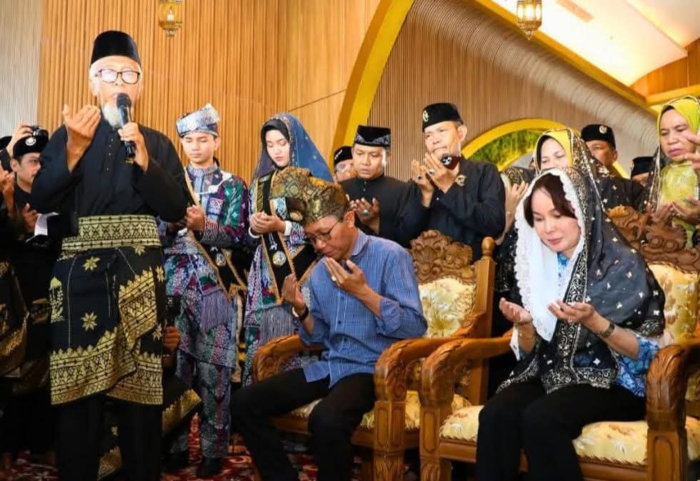 ENERGI BULAN MULIA: Wali Kota Batam/ Kepala BP Batam H Amsakar Achmad, dan Wakil Wali Kota/Wakil Kepala BP Batam Li Claudia Chandra, larut dalam doa bersama masyarakat yang menyambutnya di ruang VIP Bandara Hang Nadim Batam, Nongsa, Sabtu (1/3/2025) siang.