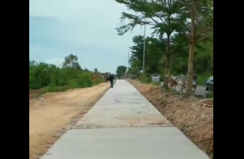 Tampak sebuah alat berat diturunkan dalam pengerjaan jalan ini, para pekerja saat ini masih melakukan pematangan lahan di beberapa lokasi dan sebagian pekerja lainnya melalukan pemasangan besi kontruksi jalan