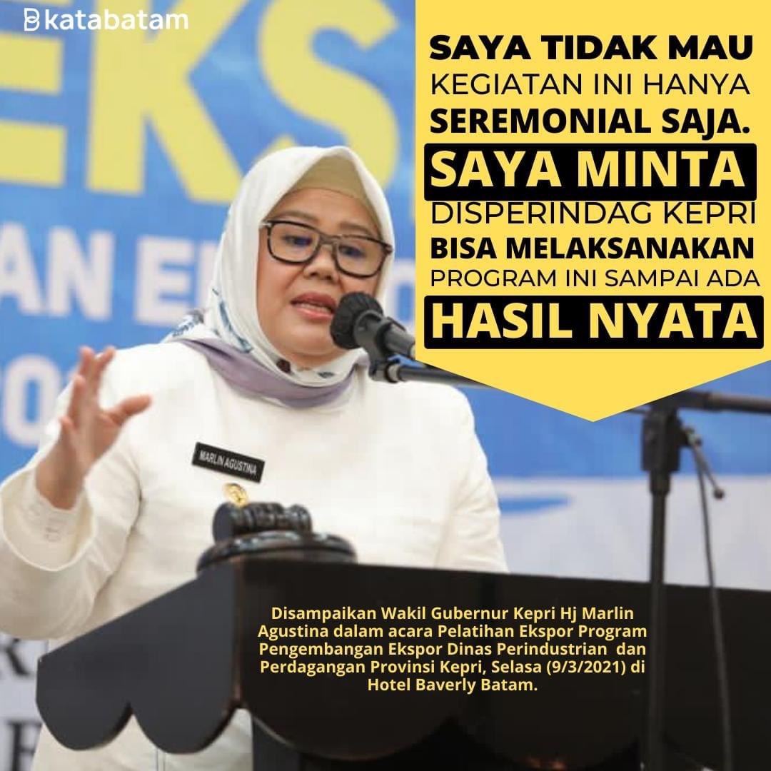 WAKIL GUBERNUR Hj Marlin Agustina meminta pelatihan ekspor untuk pengusaha UKM (Usaha Kecil Menengah) yang ditaja Dinas Perindustrian dan Perdagangan (Perindag) Provinsi Kepri, tidak sebatas seremonial (upacara pembukaan) saja. Tetapi bisa menghasilkan kerja nyata sesuai target pemerintah dalam pemulihan ekonomi.