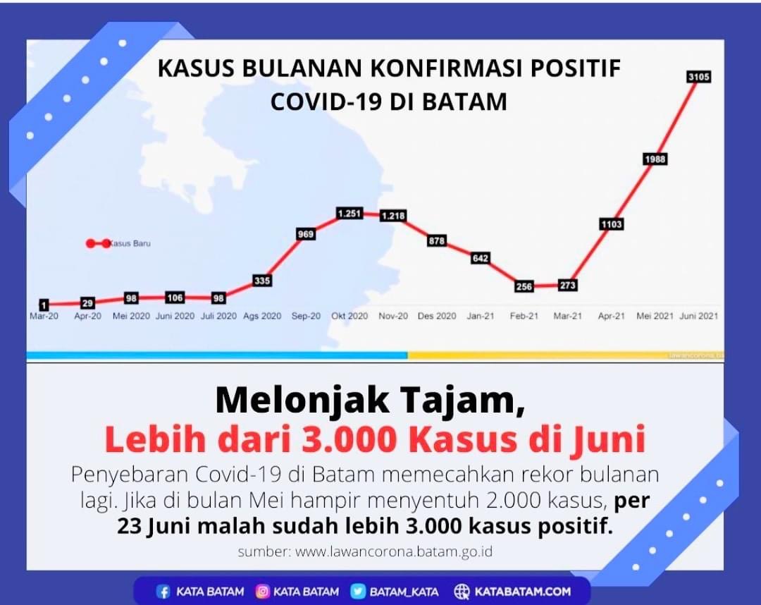 Bulan Juni 2021 menjadi bulan merah untuk jumlah kasus Covid-19 di Batam. Sepanjang bulan ini, Batam mencatatkan lebih dari 3.000 kasus positif Covid-19, tertinggi sepanjang pandemi.
