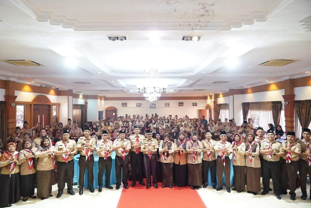 RAPATKAN BARISAN: Ketua Kwarcab Gerakan Pramuka Kota Batam Kak H Jefridin, rapatkan barisan di sela membuka Mabigus, dan Pembina Gugus Depan SD/MI Se-Kwarran Bengkong, Tahun 2023, di Golden Prawn, Bengkong, Rabu (6/9/2023).