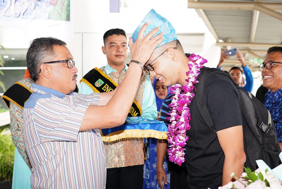 Karangan Bunga dan Tanjak dari Jefridin Sambut Wisman Pertama 2023 di Batam