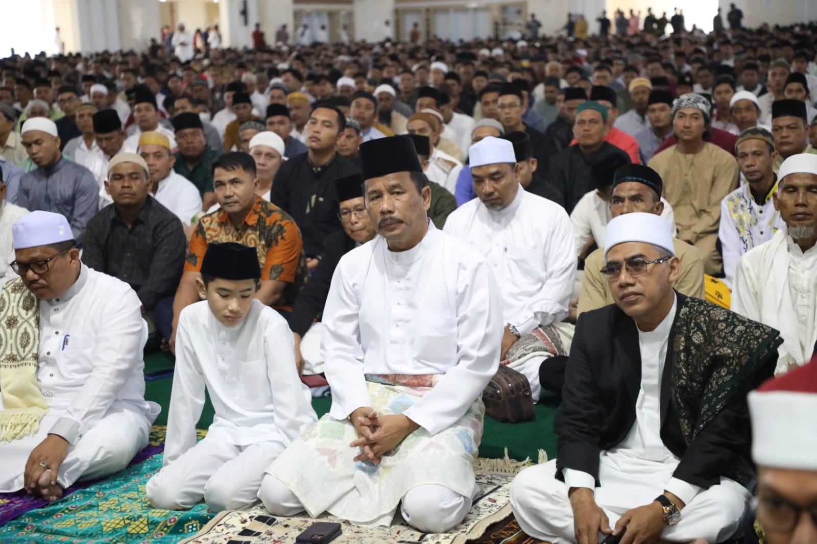HMR mengenakan peci hitam, dan baju Melayu lengkap dengan sampinnya. Dia duduk di barisan paling depan bersama putra bungsunya, Rivan.