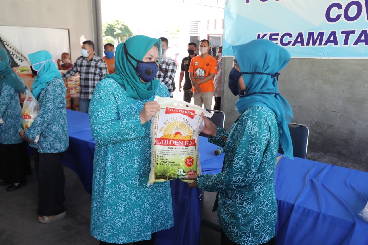 Pertama HMA menuju Kantor Camat Sungaibeduk. Di sini istri Walikota Batam H Muhammad Rudi (HMR) ini menyerahkan 130 paket sembako, 100 masker.