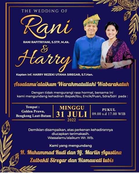 Rangkaian dimulai pada akad nikah yang akan digelar Kamis (28/7/2022) nanti. Acara sakral yang dimulai pukul 09.00 pagi itu, akan dipimpin langsung ayahanda Rani, H Muhammad Rudi (HMR), yang tak lain Wali Kota Batam/Kepala Badan Pengusahaan Batam.
