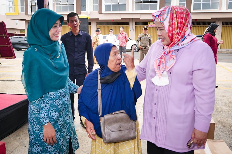 KETUA TP PKK Kota Batam Hj Marlin Agustina, mendengar curhatan seorang ibu lansia, di sela menghadiri Pemberian Bingkisan Bahan Natura dan Pakan Natura, bagi Lanjut Usia di Kecamatan Nongsa Tahun 2022, di Fasum Ruko Summerland, Kelurahan Batubesar, Kecamatan Nongsa, Kota Batam, Selasa (6/9/2022) petang.