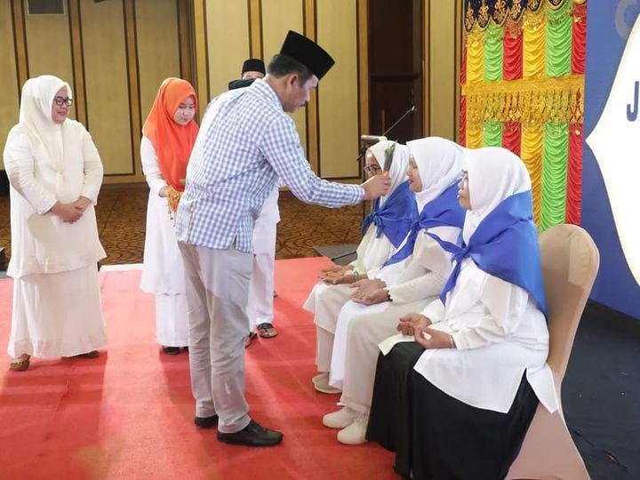 BATAMCENTRE, KataBatam- Keharuan hadir saat Wali Kota Batam H Muhammad Rudi (HMR) bersama Wakil Gubernur Kepulauan Riau Hj Marlin Agustina, hadir di acara pelatihan manasik dan pelepasan Jemaah Calon Haji (JCH) Kota Batam 1444 H/2023 M di Swissbel Hotel Harbour Bay, Sabtu (20/5/2023).