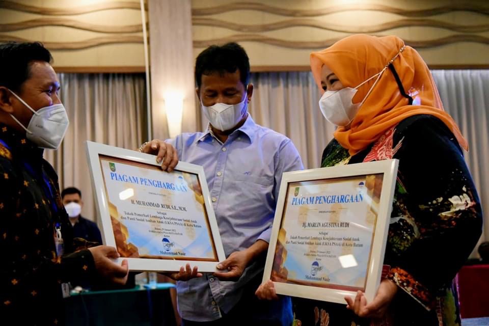 Foto: Wali Kota Batam H Muhammad Rudi, dan Wakil Gubernur Kepulauan Riau Hj Marlin Agustina, saat menerima penghargaan sebagai tokoh peduli anak belum pekan lalu.