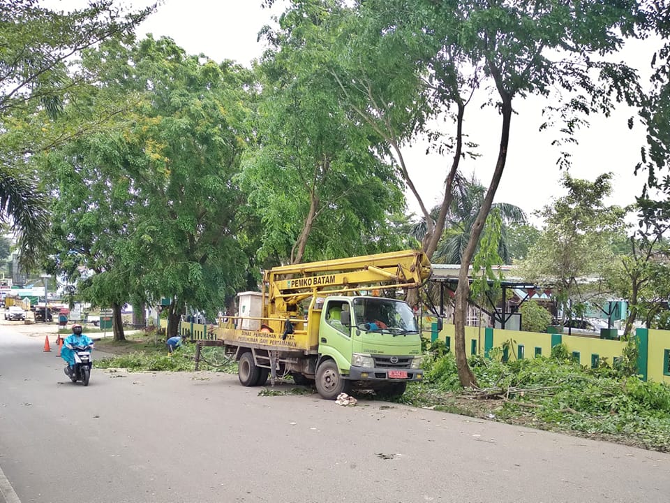BATAMKOTA, KataBatam- Dinas Perumahan Rakyat, Pemukiman, dan Pertamanan (Disperakimtan) Kota Batam, memangkas ranting pohon di jalan Raja Ali Kelana, tepatnya di depan Mall Botania 2, Batamkota, Kota Batam, Selasa (7/3/2023).