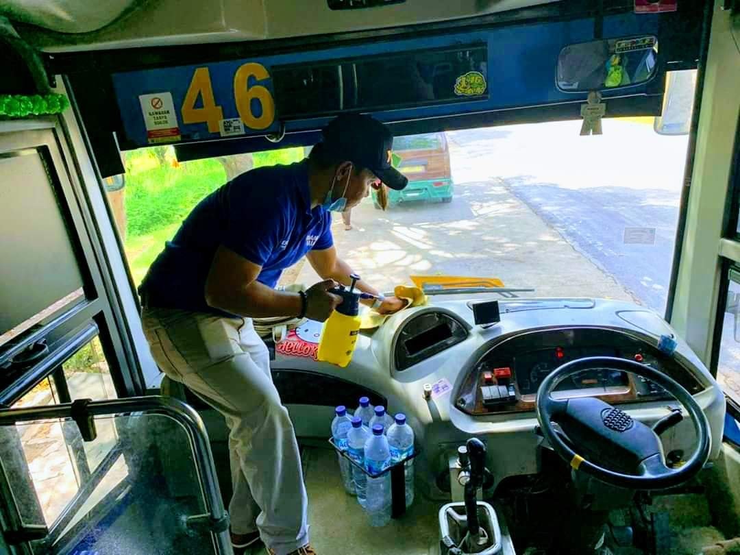 Upaya lain yang dilakukan untuk mencegah penularan covid-19 yaitu menyemprot bus dengan disinfektan. Penyemprotan rutin dilakukan sehari dua kali, tiap pagi dan sore.