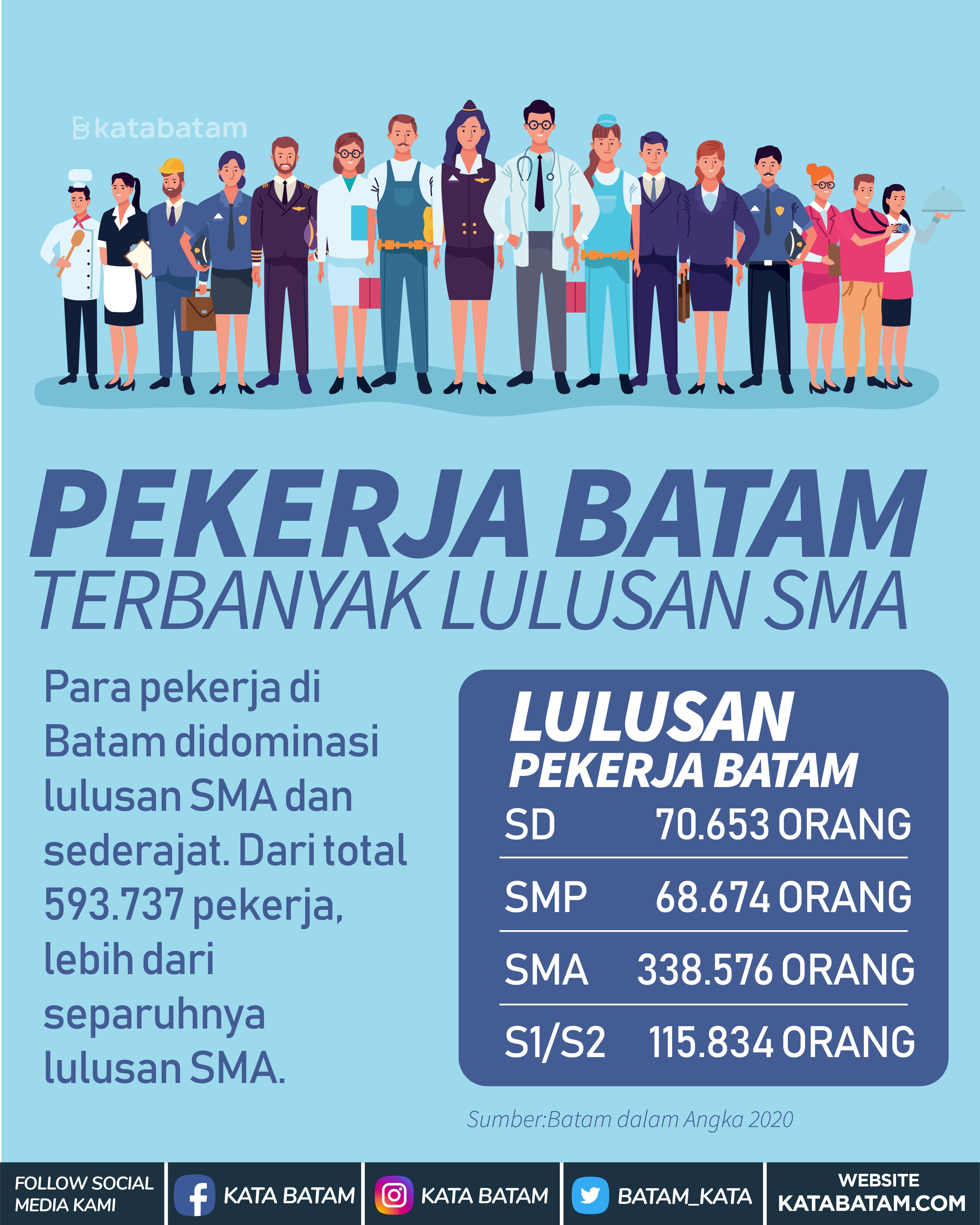 Data terbaru di Batam dalam Angka 2020, pekerja SMA di Batam sebanyak 338.576 orang, disusul kemudian lulusan sarjana. Lulusan SMP terbilang paling sedikit, hanya 68.674 orang. ***