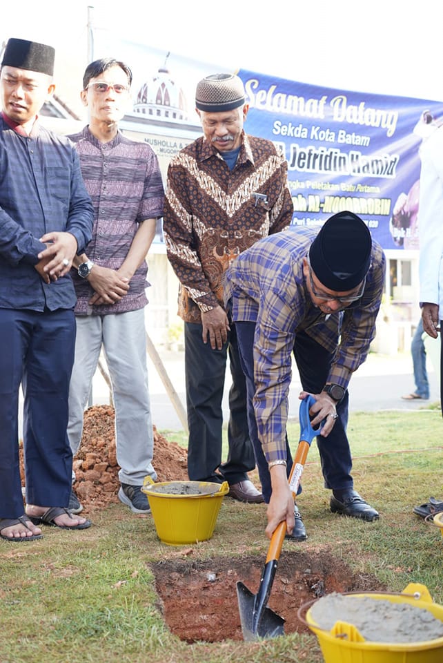 NONGSA, KataBatam- Sekretaris Daerah Kota Batam H Jefridin, meletakkan batu pertama pembangunan Musala Al Muqorobbin, di RT 3 RW 20, Perumahan Puri Selebriti 3, Batubesar, Nongsa, Minggu (14/5/2023).