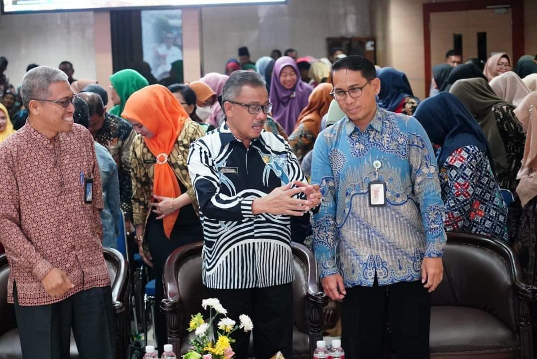 AYO SEKOLAH: Sekretaris Daerah Kota Batam H Jefridin, berbincang dengan Kepala Dinas Pendidikan Kota Batam Try Wahyu Rubianto, bersiap membuka Sosialisasi Penanganan Anak Tidak Sekolah di Kota Batam, di Aula Engku Hamidah Lantai IV, gedung Pemerintah Kota (Pemko) Batam, Batamcenter, Kamis (5/9/2024).
