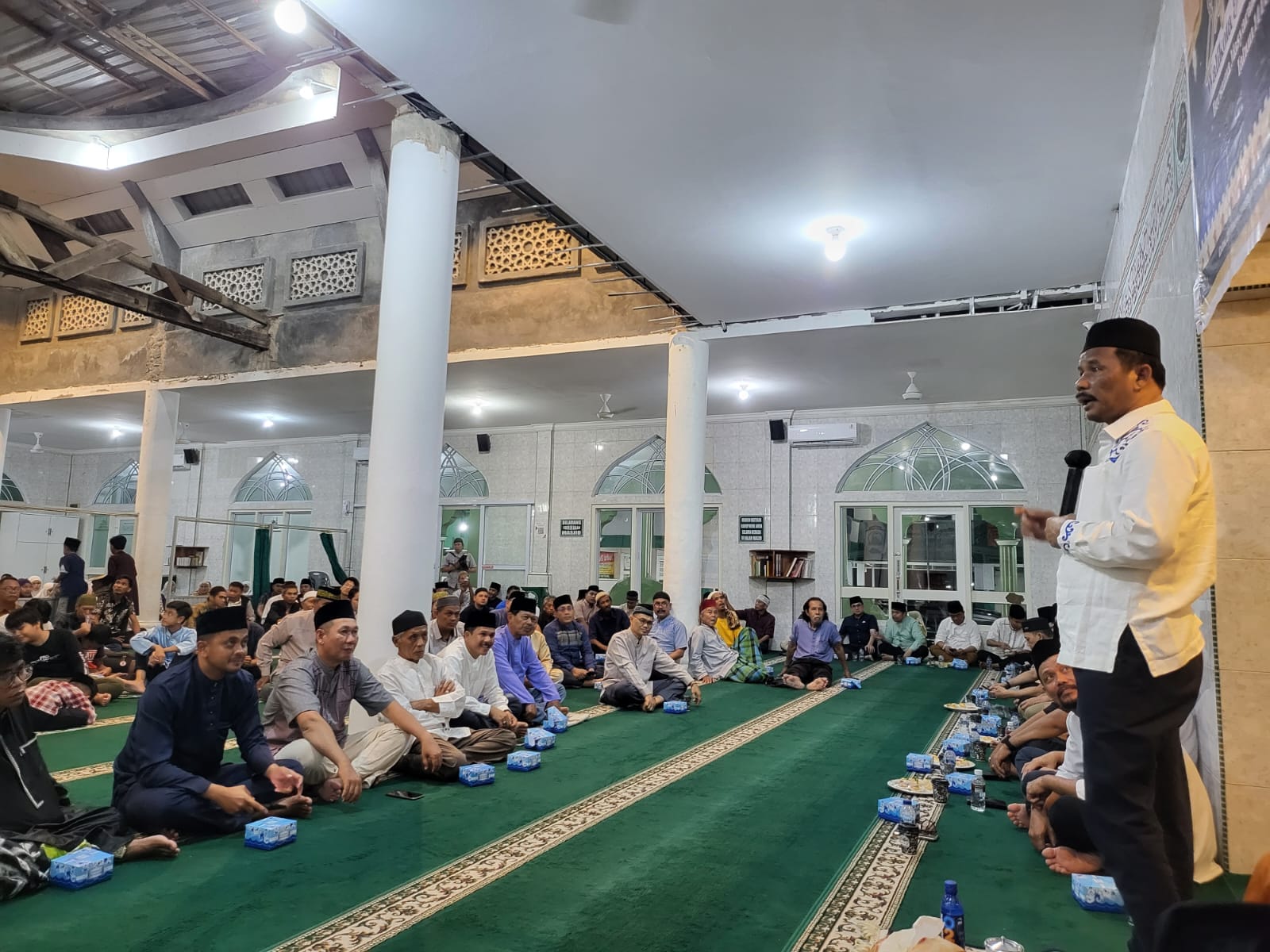 BAHAGIA: Wali Kota Batam H Muhammad Rudi (HMR), memberi sambutan Safari Ramadan di Masjid An-Nur, Baloi, Blok IV, Kelurahan Batuselicin, Lubukbaja, Kota Batam, Rabu (29/3/2029) malam. Kubah masjid tersebut belum ada.