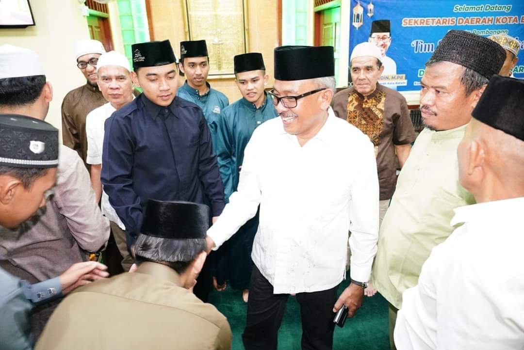 RAMADAN CERIA: Sekretaris Daerah Kota Batam H Jefridin, disambut jemaah saat melakukan safari Ramadan di Masjid Nurul Qomar, Komplek Pengairan, Kelurahan Tanjungriau, Kecamatan Sekupang, Senin (18/3/2024).