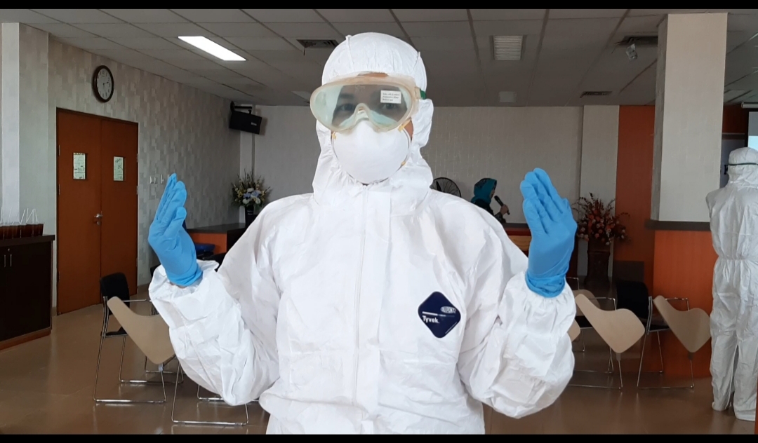 Di sini kami sertakan demonstrasi Alat Perlindungan Diri (APD) yang dipakai tenaga kesehatan (khususnya, perawat dan dokter) saat melakukan tindakan di lingkungan yang sangat infeksius (pasien penyakit menular)