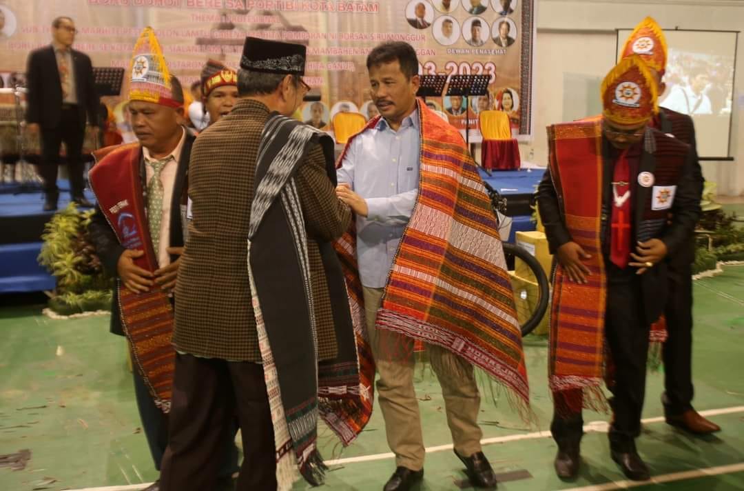 MUKAKUNING, KataBatam- Ketua Umum Punguan Borsak Sirumonggur Saportibi (PBSS) Kota Batam St Parlin M Sihombing, menyematkan kain tenun ulos Batak kepada Wali Kota Batam/Kepala Badan Pengusahaan Batam H Muhammad Rudi (HMR).