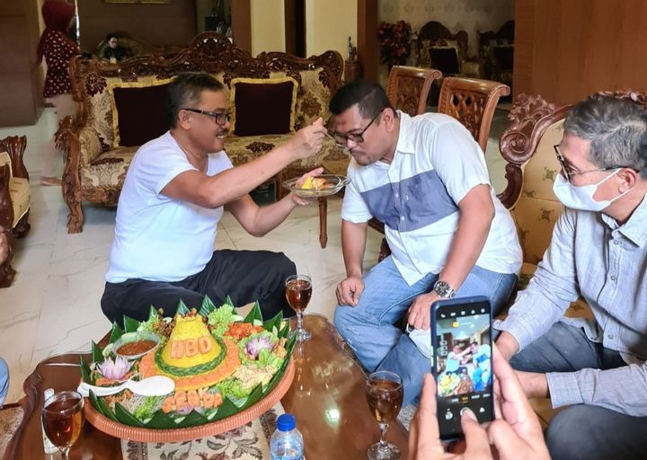 Tentu saja Jefridin tak mampu berkata-kata lagi. Namun tak lama ia bisa menguasai suasana. Selanjutnya, Jefridin diminta memotong nasi tumpeng dan menyuapkan kepada satu-persatu rekan gowesnya itu.