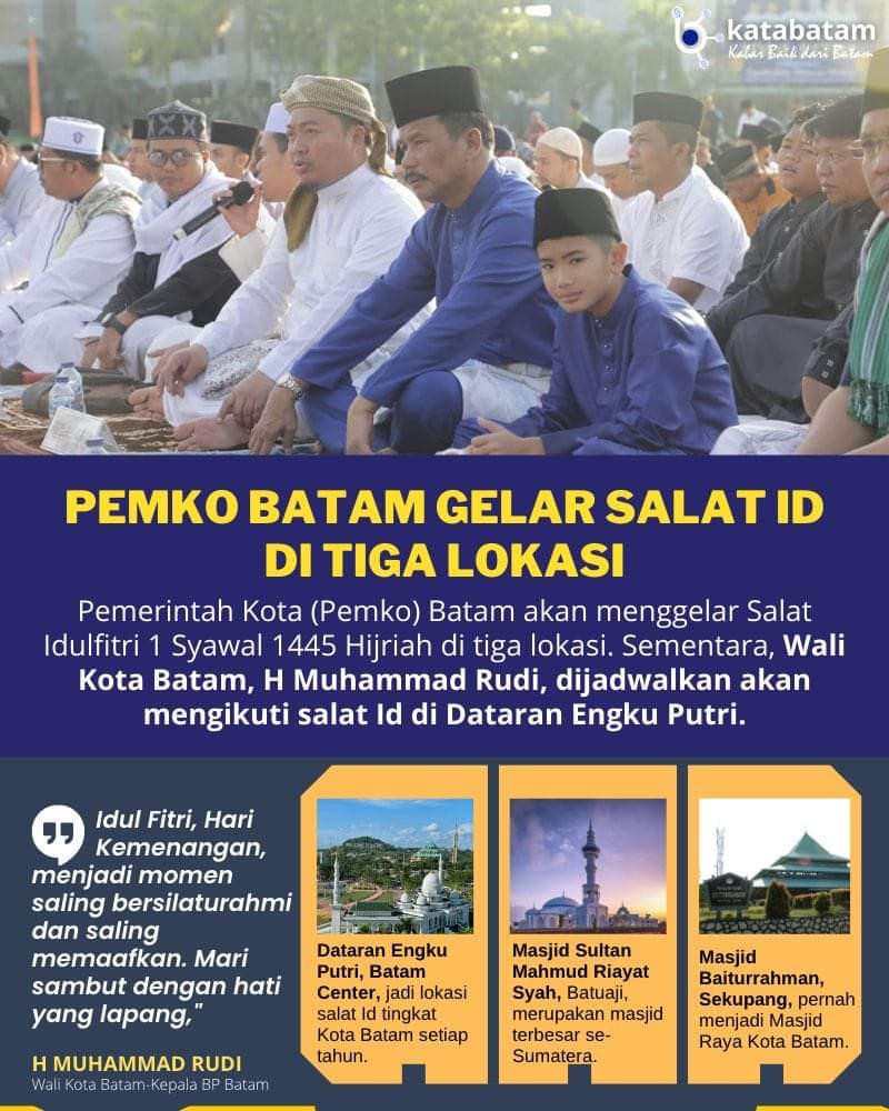 “Untuk warga Batamcentre dan sekitarnya bisa melaksanakan salat Idul Fitri di Dataran Engkuputri, dan masyarakat Batuaji dan sekitarnya di Masjid Sultan Mahmud Riayat Syah, serta warga Sekupang dan sekitarnya bisa di Masjid Baiturrahman,” ajaknya.