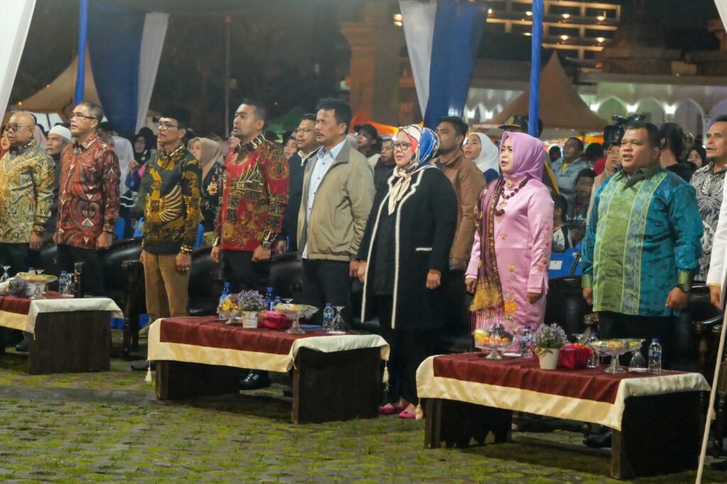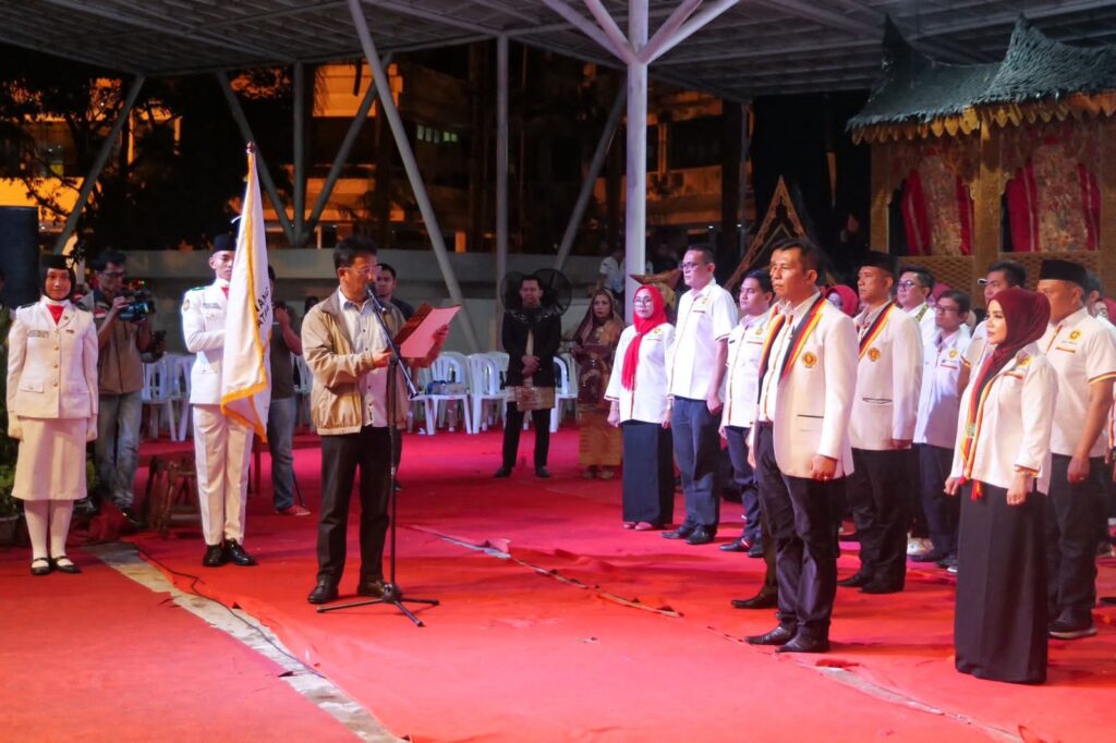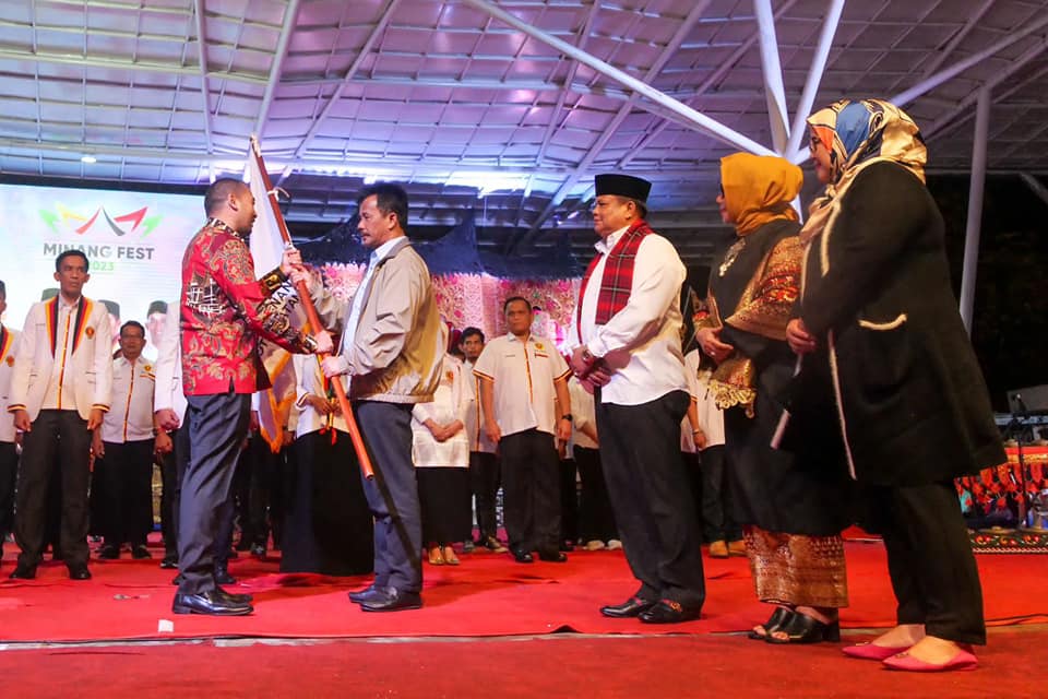 WAGUB Marlin menyaksikan Wali Kota Batam H Muhammad Rudi (HMR), menyerahkan pataka dalam Pelantikan Pengurus DPP Gema Minang Kota Batam, periode 2022-2027, semarak "Minang Fest 2023", di Dataran Engku Putri Batamcenter, Sabtu (4/3/2023) malam.
