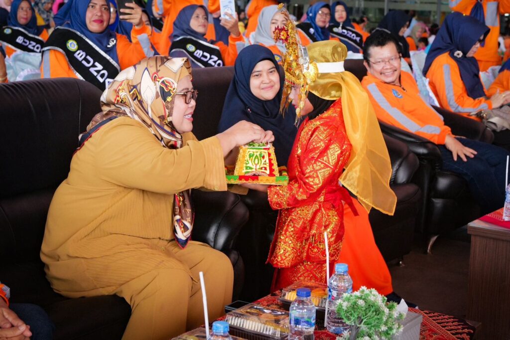 BUNDA Marlin, menerima ucapan selamat datang dari anak-anak di sela membuka Porseni Himpaudi, IGTKI, PKG dan IGRA, di MB2, Batamcentre, Rabu (10/5/2023).