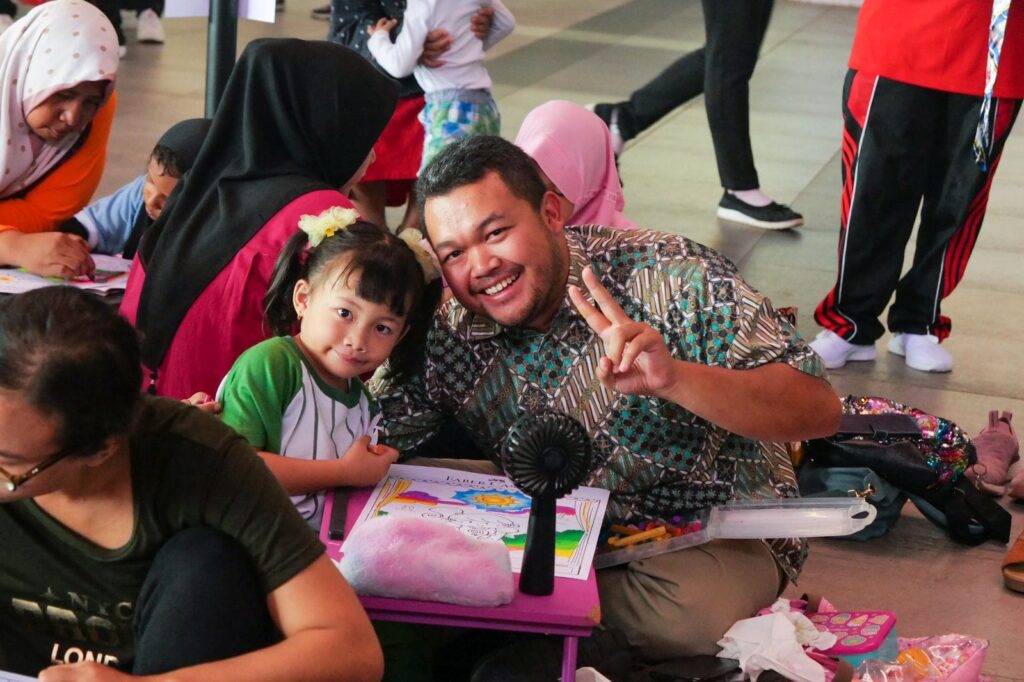 SEORANG ayah dan putrinya, saat ikut lomba melukis di ajang Porseni Himpaudi, IGTKI, PKG dan IGRA, di MB2, Batamcentre, Rabu (10/5/2023).
