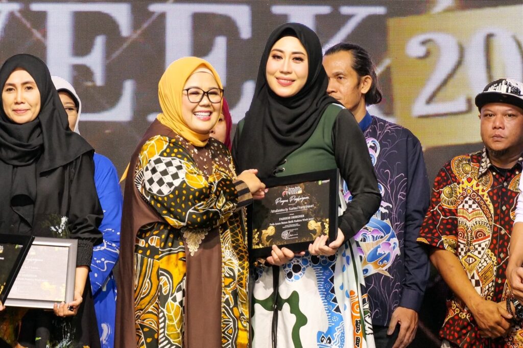 WAGUB Marlin, menyerahkan sertifikat kepada pembatik dan desainer di sela membuka Malam Puncak Batam Batik Fashion Week (BBFW) di Dataran Engku Putri, Kota Batam, Jumat (23/12/2022) malam.