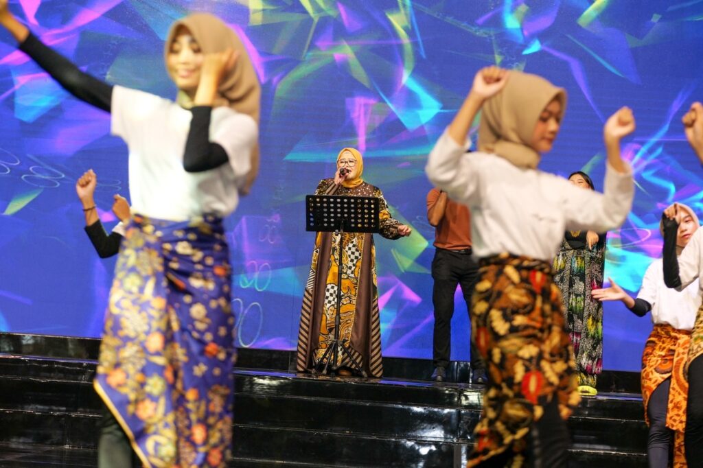 WAGUB Marlin, membawakan lagu diiringi para penari pada Malam Puncak Batam Batik Fashion Week (BBFW) di Dataran Engku Putri, Kota Batam, Jumat (23/12/2022) malam.
