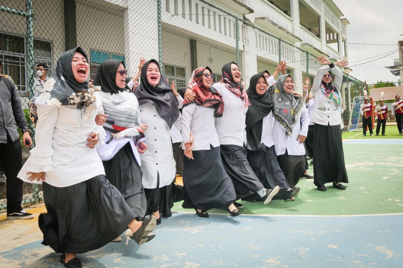 Melihat Ketua TP PKK Kota Batam ini ikut menari, para guru pun tak lengah lagi. Mereka berbaur bersama, menemani Wagub Marlin berzapin.