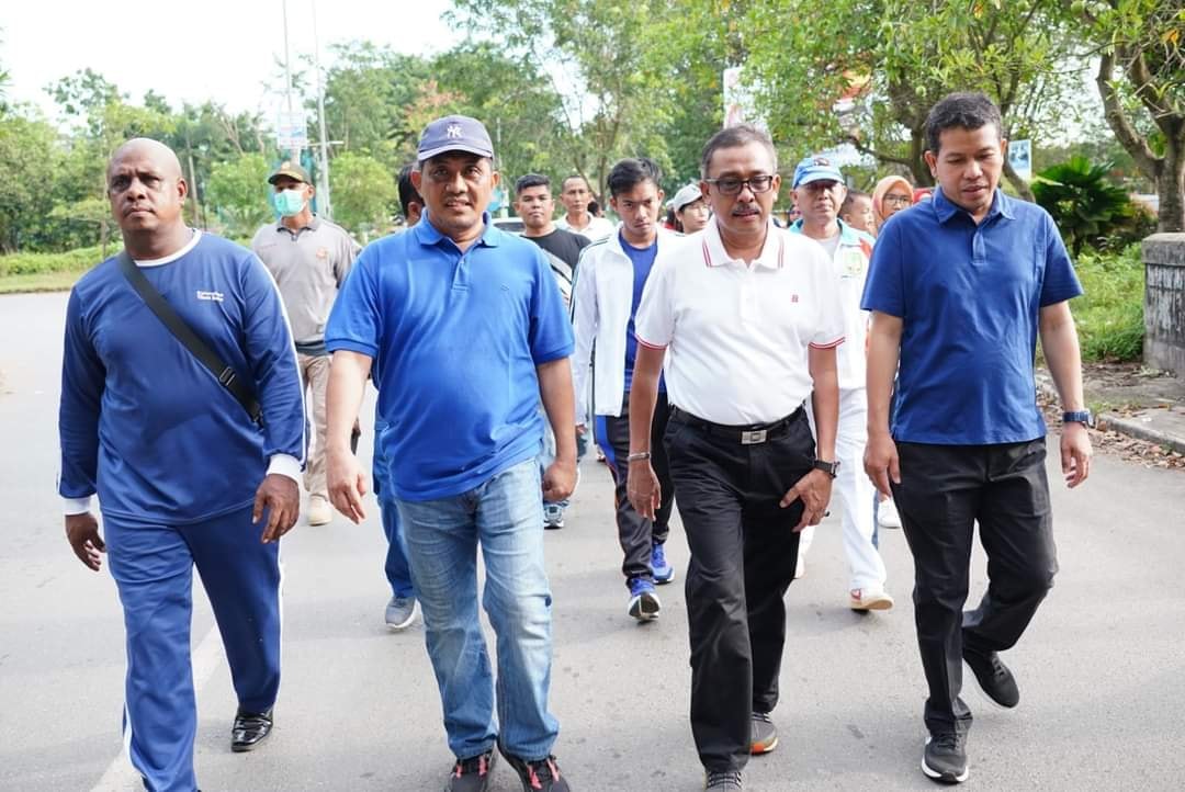 Selanjutnya di hari Minggu (30/10/2022) pagi, Jefridin mengibaskan bendera start saat melepas peserta jalan sehat memperingati Sumpah Pemuda ke-94 di Amati Cafe Ruko Tiban. Tak lupa ia berpantun: