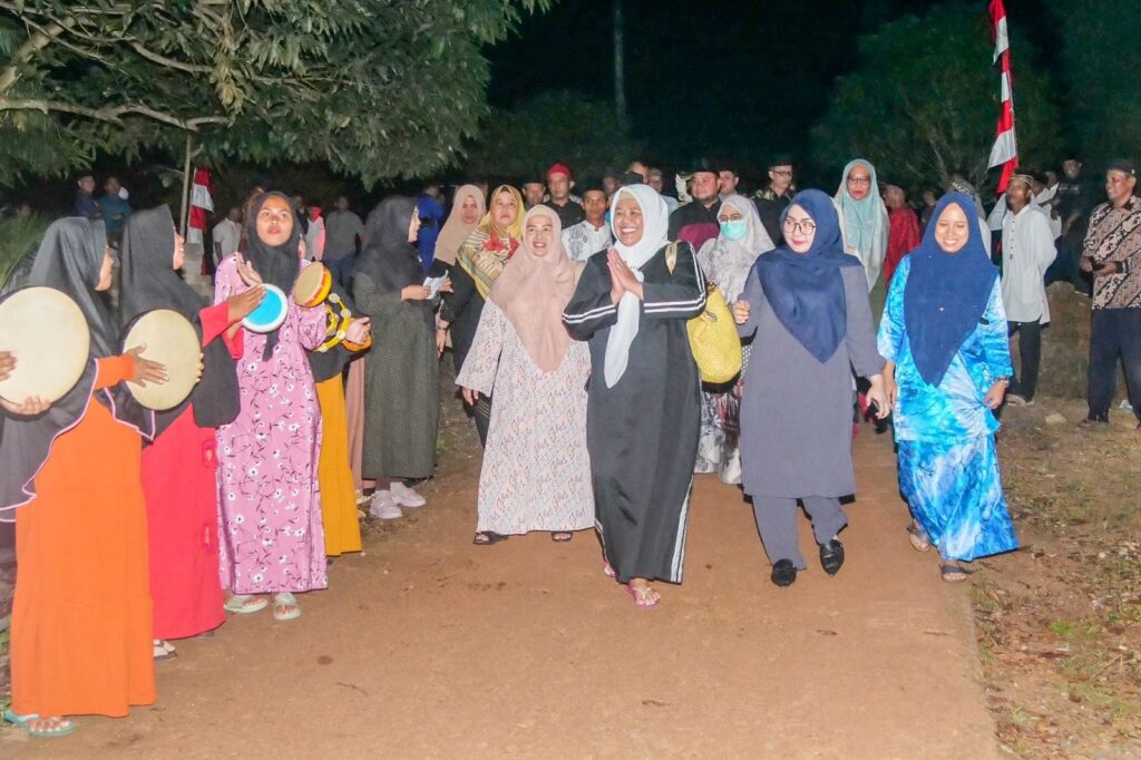 KETUA TP-PKK Kota Batam Hj Marlin Agustina, diiring warga saat melakukan Safari Ramadan di Musala At Taqwa, Pulau Nipah, Kecamatan Bulang, Kota Batam, Senin (27/3/2023) malam.