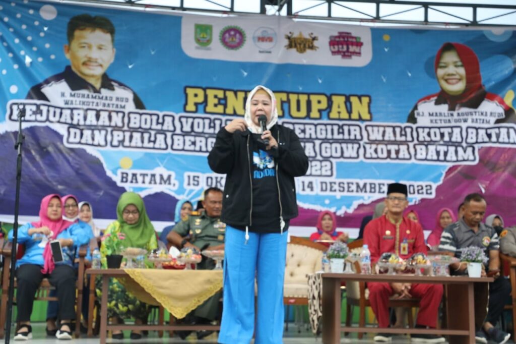 SAGULUNG, KataBatam- Wakil Gubernur Kepulauan Riau Hj Marlin Agustina, menutup pertandingan bola voli di Flamboyan Community Centre, Sungaipelunggut, Kecamatan Sagulung, Kota Batam, Rabu (14/12/2022) petang.