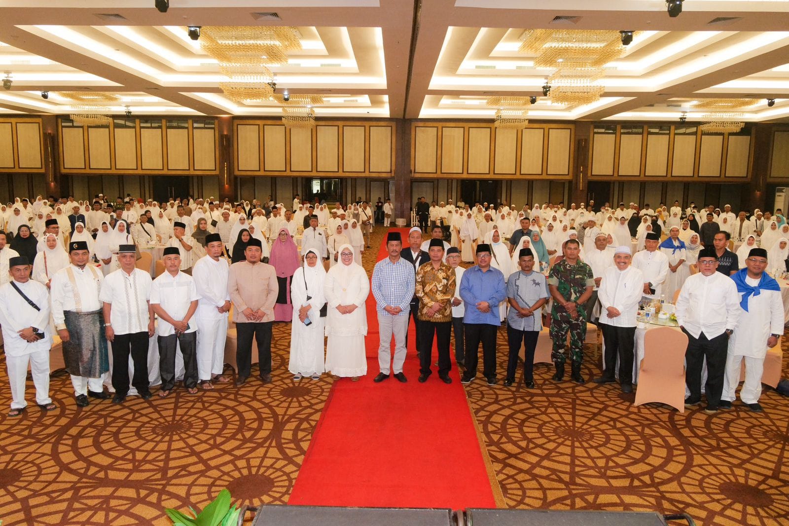 WAGUB Marlin dan Wali Kota Batam H Muhammad Rudi (HMR), foto bersama di acara pelatihan manasik dan pelepasan Jemaah Calon Haji (JCH) Kota Batam 1444 H/2023 M, di Swissbel Hotel Harbour Bay, Sabtu (20/5/2023).
