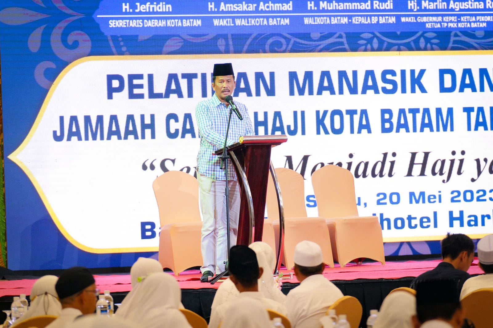 WAGUB Marlin, memberi sambutan di acara pelatihan manasik dan pelepasan Jemaah Calon Haji (JCH) Kota Batam 1444 H/2023 M, di Swissbel Hotel Harbour Bay, Sabtu (20/5/2023).